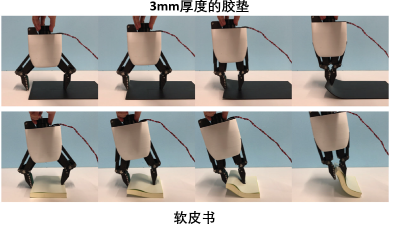 机械手的抓取过程借助于这样的结构设计,无需过于复杂的控制,机械手就可以抓取很多薄而软的物体,例如3mm厚度的脚垫,以及软皮书。
