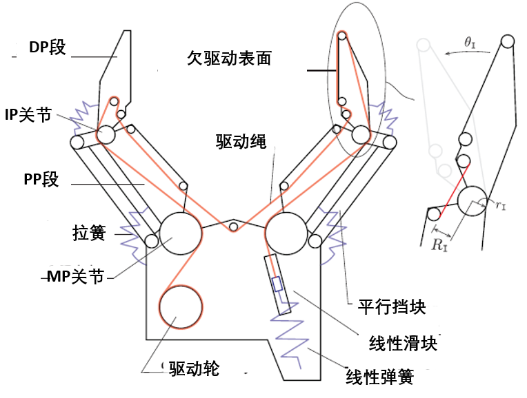 在第二个阶段,当手指和物体接触以后,电机扭矩增加,绳子的拉力大于滑动块的预紧力,因此导致滑动块开始滑动,随之而来的是指尖滑动带向着手掌内侧滑动,从而把物体拉向机械手内侧,这也正是抓取薄形的物体的关键!