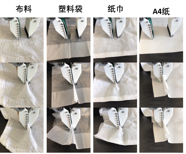 研究者还设计实验测试抓取了一些对于大多数机械手来说基本上不可能抓的起的超薄物体。例如布料,塑料袋,纸巾,以及A4纸。可以看到,借助于指尖的滑动结构,这种又软又薄的物体的抓取也不在话下!