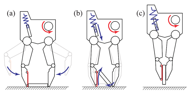 机械手的抓取过程分成三个步骤(下图中的a, b, c):在第一个步骤,手指在电机的驱动下靠近物体。在这个阶段,滑动模块的弹簧刚度大于手指关节处的弹簧刚度,因此手指的滑动带保持不动,机械手如同普通的平行夹爪一样靠近物体。