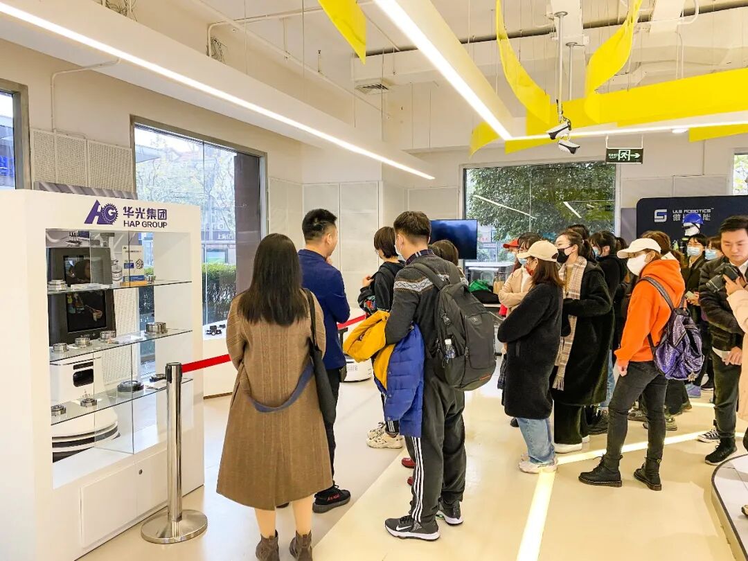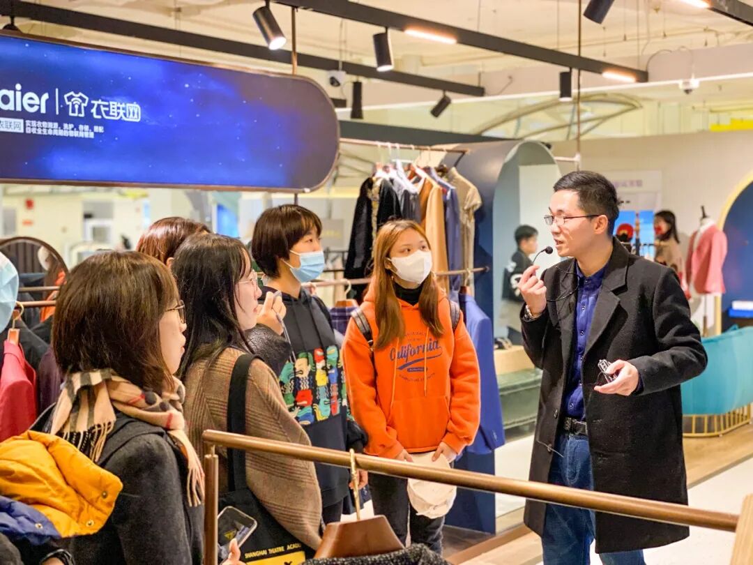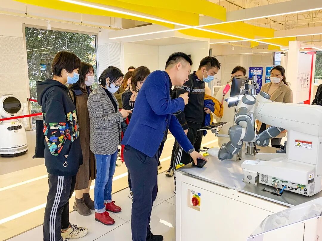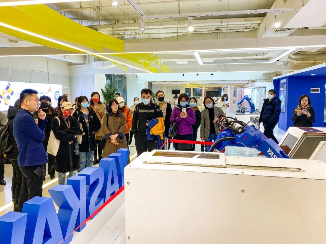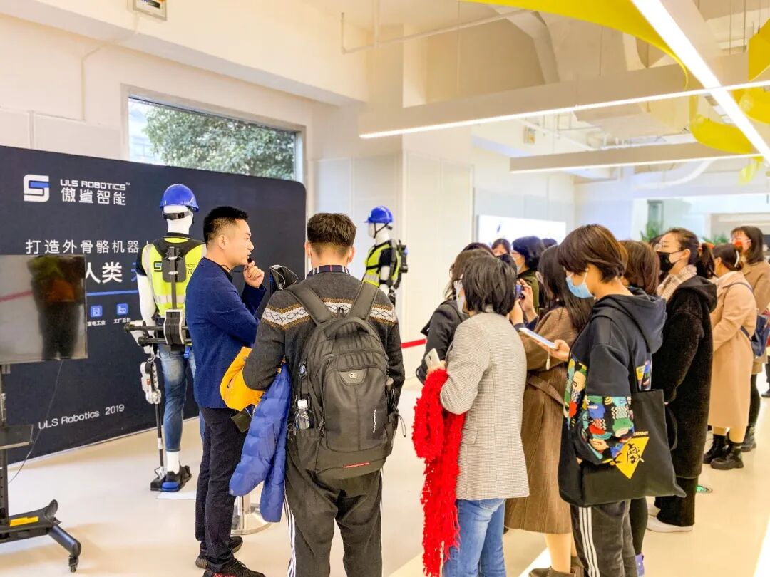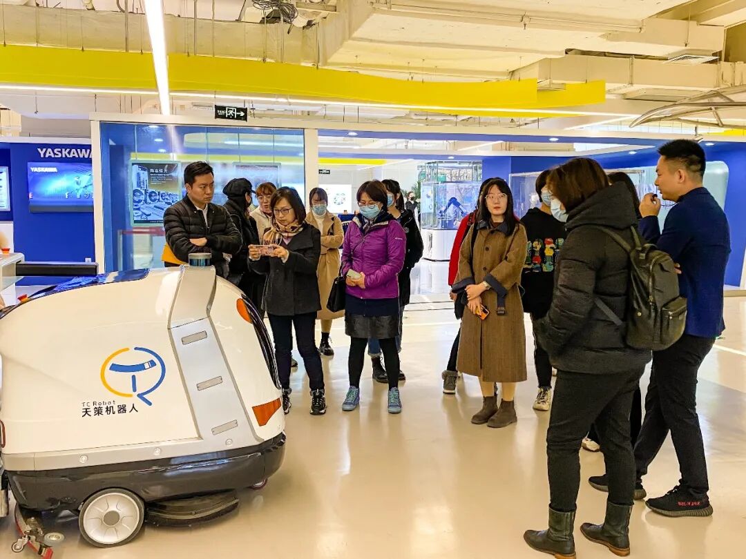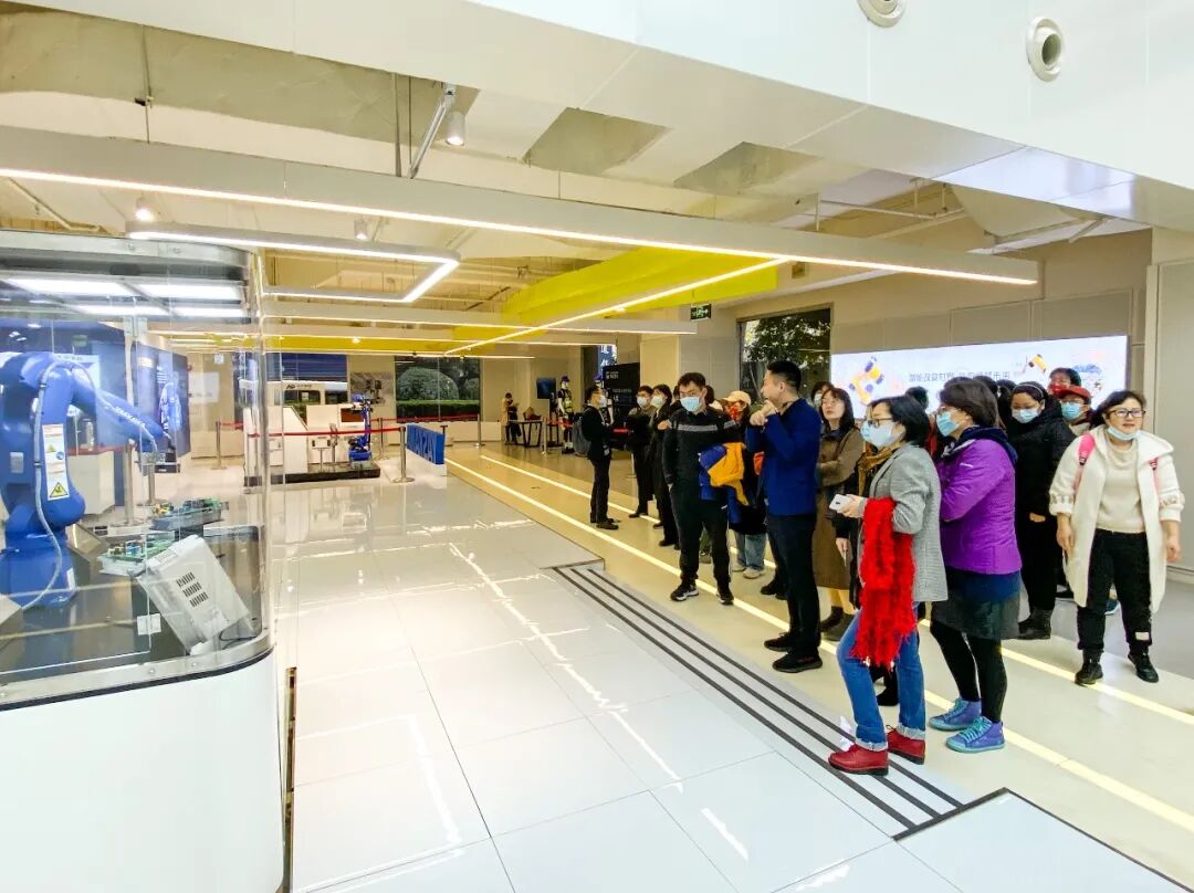 海派智谷负责人带领各学员参观了海派智谷一楼人工智能展示中心,观看学习了安川、ABB的模拟工业场景、傲鲨外骨骼机器人、天策清洁机器人;海尔负责人通过实操演示向学员们详细介绍了海尔衣联网、食联网智慧场景,并与其进行了互动体验。