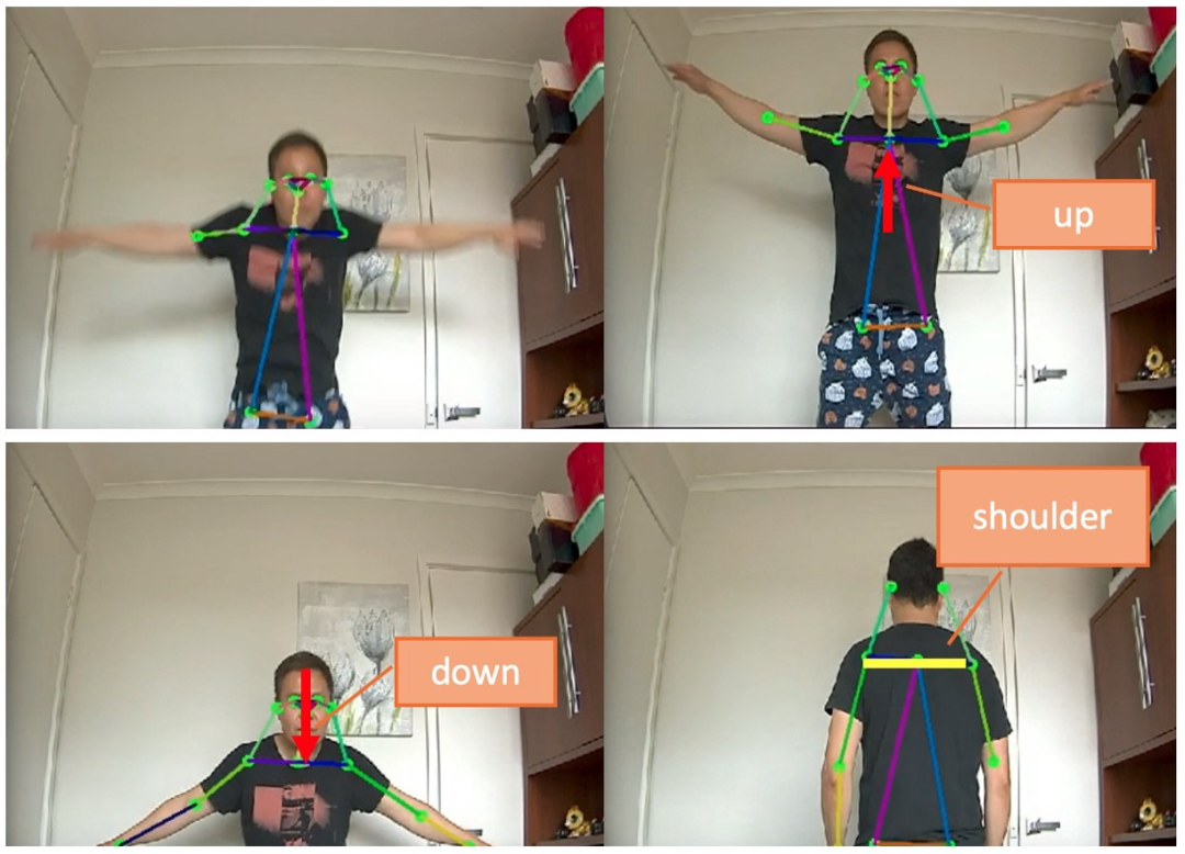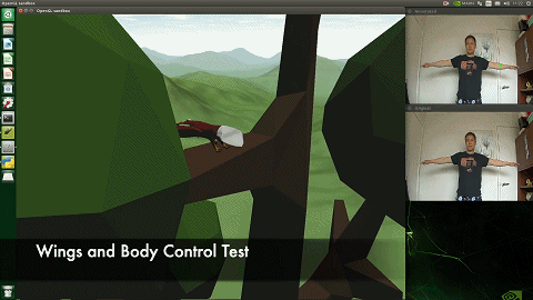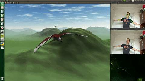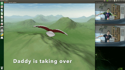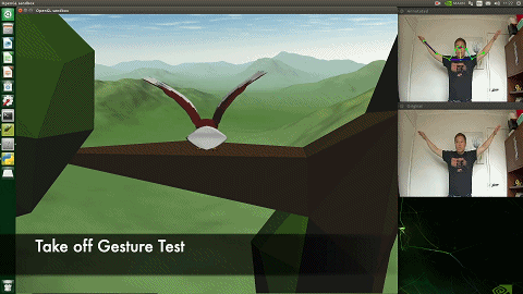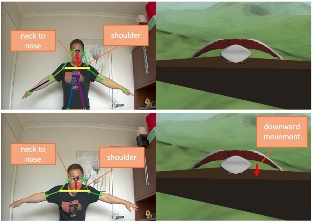 起飞姿势:当左右肩膀之间的中心点在一秒内上下移动的幅度超过阈值时,则该动作会被识别为起飞姿势。阈值是肩膀之间的长度。当这一动作被触发时,Griffin 会跳下树枝,开始飞翔。