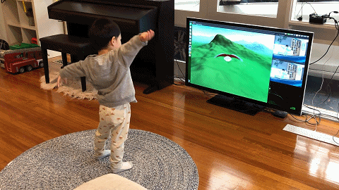 我只演示了一遍如何控制 Griffin 系统,跳一下就是起飞,展开手臂依靠姿势控制翅膀,Dexie 就学会了。由于游戏是第三人称视角,所以他很快就发现画面中翅膀的运动是直接和自己姿势同步的。随后他就开始享受自己的飞行体验了。没有什么是比你自己更好的游戏控制器了——记住乔布斯在发布第一代 iPhone 时嘲笑手写笔时所说的话。