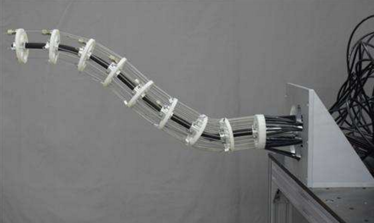 中国科学院宁波材料技术与工程研究所精密驱动与机器人团队利用绳索的高效力传导以及具有本质柔性的特点,研发了具有多个关节模块的绳索驱动连续体机器人臂,绳驱动机器人臂采用多根轻质绳索协同驱动。与传统主动关节驱动的机器人臂不同,绳驱动机器人臂是由被动关节支撑,主动绳索驱动,由于主动绳索的驱动装置全都安装在机座上,因此绳驱动机器人臂具有自重轻、转动惯量小和易于实现变刚度控制等优点,既能够产生本质安全的运动,也能达到较高的载重-自重比。