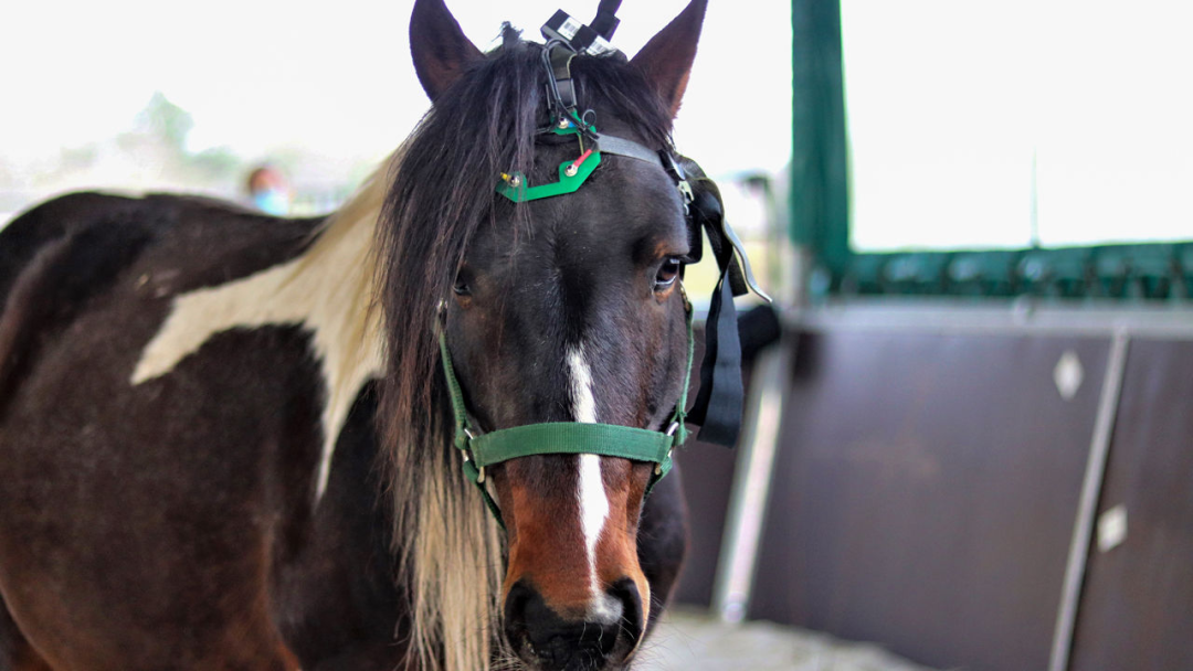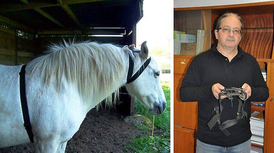 Hugo Cousillas 在马的头部测试了这种可穿戴式头带。