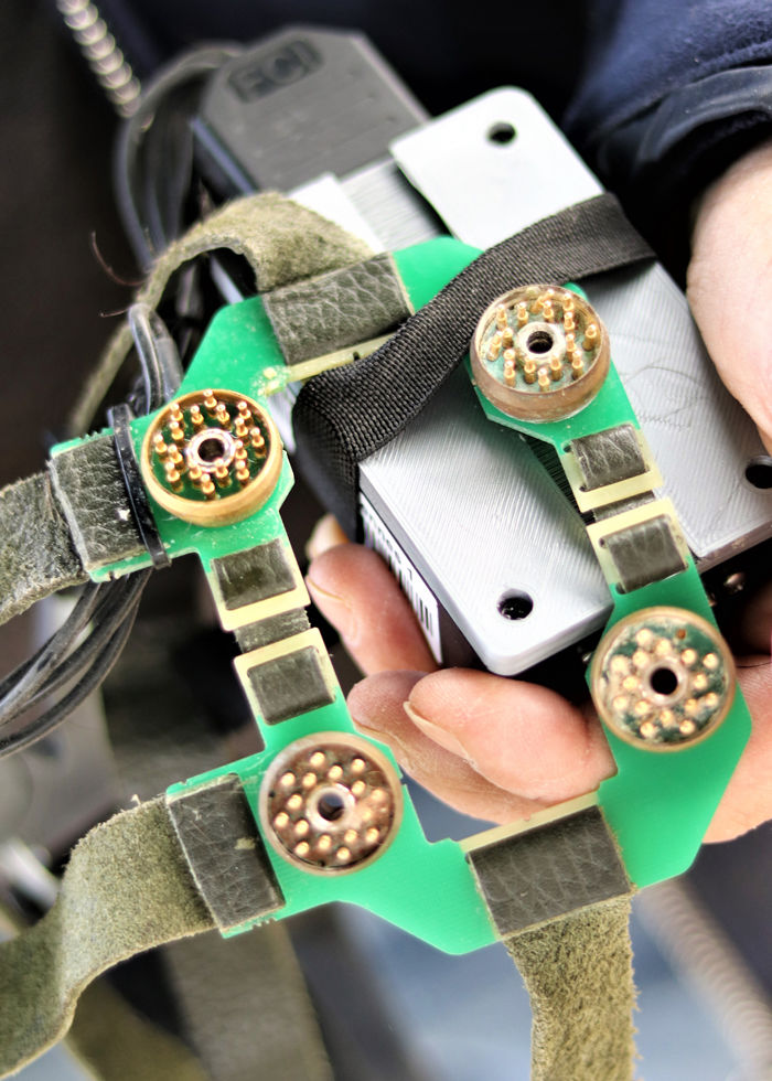 Cousillas 前后花费六年时间研发了一种适用于马的穿戴式头带。与人类可能具有数十甚至数百个电极的电脑图不同,马的头带只需要四个电极,即可以从马的桃子大小的大脑左右半球中接收电波。该头带的整体设计图如下所示: