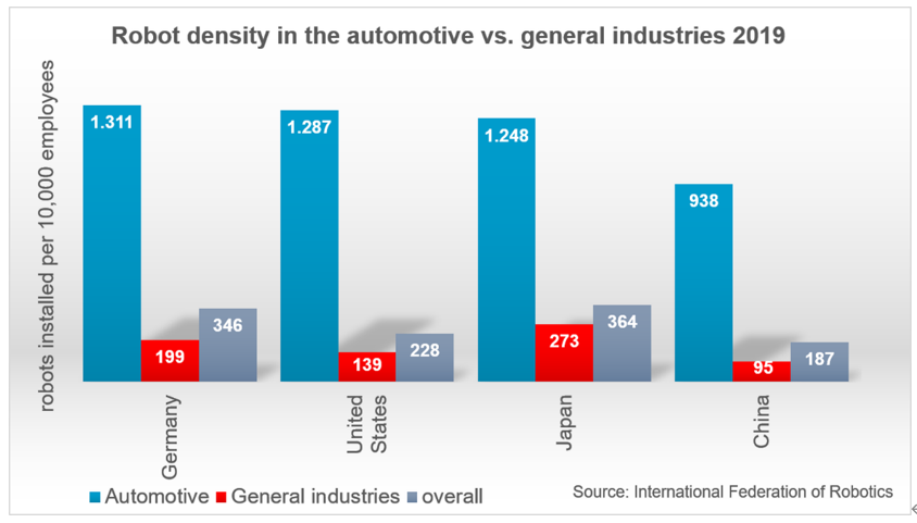 国际机器人联合会2021年3月16日在法兰克福报道,美国汽车工业的机器人密度达到每万名工人1287台,创历史新高,名列全球第七名,接近德国的1311台和日本的1248台。中国汽车工业的机器人密度是938台,目前在全世界排名为十二位。“自动化不仅对新冠疫情后经济复苏至关重要,也对后疫情时期的发展和进步起到关键作用。”国际机器人联合会主席Milton Guerry表示,“2008年金融危机后,通用汽车(General Motors)、福特(Ford)、菲亚特-克莱斯勒(Fiat-Chrysler)和特斯拉(Tesla)等公司在机器人和自动化领域进行了大量投资。结果,汽车工业创造了数千个新的就业机会。经过这么多年的发展,现在技术更加进步,我们完全有机会学习他们成功的经验,变得比以前更加强大。”