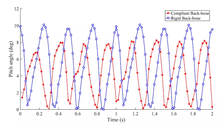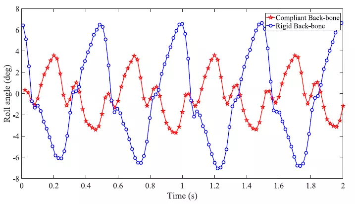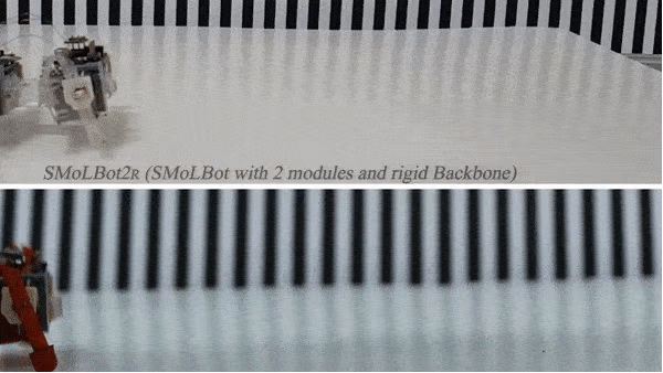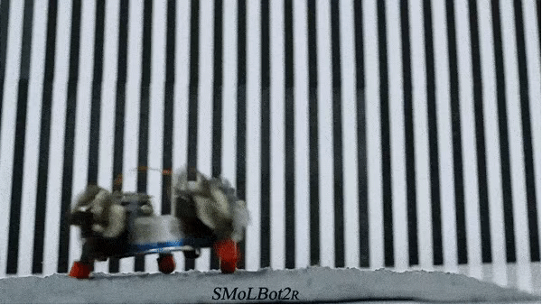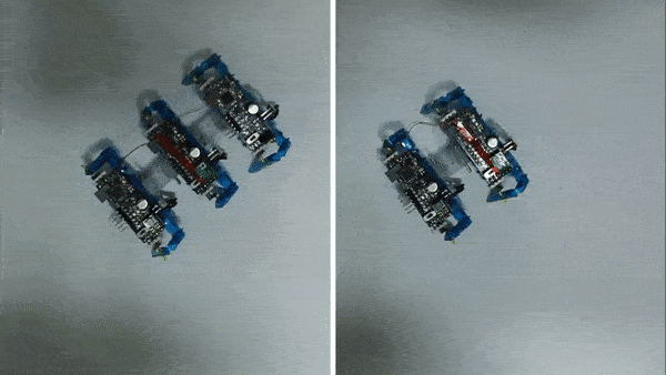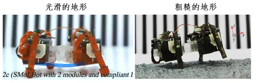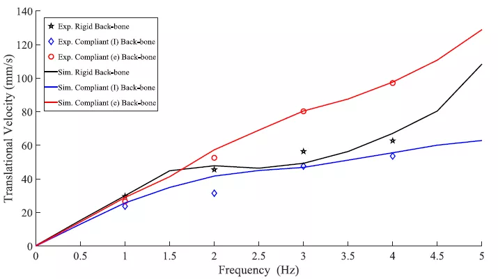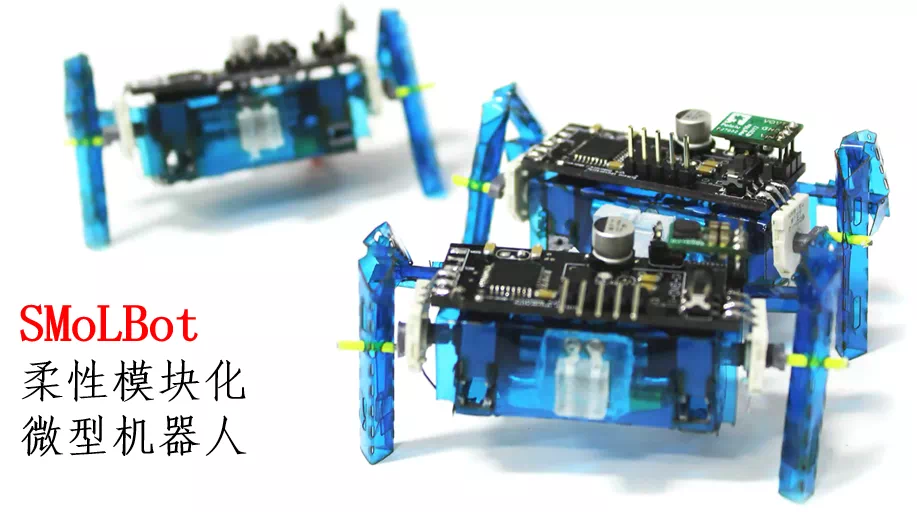 本文转自|机器人大讲堂 在一个题为“我为什么要制造米粒大小的机器人”的TED演讲中,演讲者Sarah Bergbreiter教授用这么几句话阐述了研究微型机器人的意义:“想象一下地震等自然灾害过后,断壁残垣,这些小机器人穿梭在废墟中,寻找生还者的画面。或者想象一下,一当微型机器人能在你的血液中游动,为你检查,排除病灶,也许医生不再需要开刀就能利用机器人替你手术……”。(感兴趣的小伙伴可以百度这个演讲视频,学习科学知识的同时还可以练习英语喔!) 图1 模块化微型机器人SMoLBot 总的来说,和大家常见的常规尺寸机器人相比(例如机械狗,人形机器人等),微型机器人制造成本低廉,结构简单,运动灵巧。它们非常适合例如检测,搜救等对于小尺寸有着需求的应用场景。高度的可操控性,稳健的运动以及表面适应能力让微型机器人可以通过极其狭小的空间,或者是在复杂的环境中进行一些探索。下图是一些常见的微型机器人,他们分别是(从左上往右下依次列出):来自MIT的Self-folding robot, 来自EPFL的Alice mobile robot,来自Harvard的HAMR,以及来自UC Berkeley的DASH。 图2 TED讲座中硬币大小的微型机器人 小编最近看到一篇关于微型机器人的研究论文,介绍了一款融合了折纸技术(Origami),软体机器人技术(soft robotics)以及模块化设计的SMoLBot微型机器人。SMoLBot是由土耳其的毕尔肯大学的研究团队开发研制的,于今年的7月份发表于国际机器人期刊《IEEE机器人与自动化通讯》(IEEE Robotics and Automation Letter)上。SMoLBot机器人结构精巧迷你,外型简单,它动起来仿佛一只机械昆虫。模块化设计的SMoLBot身体由多个具有相同或者相似功能的模块组成,根据不同的应用场景,可以选择2个模块或者是3个模块,模块和模块之间由柔性或者刚性的“仿生脊柱” (PDMS材料)来连接。 图3 常见的几种微型机器人 SMoLBot的这种模块化设计让微型机器人的加工方式变得简单快捷而且价格低廉,另外,当某一个模块发生故障时,更换修理机器人也变得极其方便。每一个小模块包含一个“身体部分”和两条独立控制的“机械腿”,在身体内部囊括了小型控制板(Atmega-328P),两个直流电机(微型行星齿轮减速电机),一块微型电池(3.7V, 150mAh Li-Po电池),以及两个机械锁扣结构。每一个模块的框架结构由“折纸设计”切割组合而成。 图5. SMoLBot的单个模块 我们先来欣赏一下SMoLBot灵巧的运动展示,在第二部分会为大家介绍它的结构设计,以及论文中提及的一些对于它行走能力的简单测试。文末附有论文链接和完整版视频,不要错过喔! 图6 双模块行走展示—硬软脊柱对比 图7. 三模块行走展示——硬软脊柱对比 图8. 转弯步态展示 图9. 双模块——粗糙地面行走 图10.三模块——粗糙地面行走 SMoLBot的身体模块是用厚度为100微米的“醋酸纤维素纸(cellulose acetate sheets)”切割而成,这是一种在微型折叠机器人中很常用的材料。为了增加结构的强度,研究者利用了了T折叠结构和锁扣固定结构来作为构建身体模块的主要结构。当身体模块按照设计好的折叠之后,内部留好了相应的空间,可以依次地摆入电池,脊柱连接件,电机,以及控制板等零件,将空间利用率最大化。 图11.可以直接切割,拼装的折纸结构组成它的身体 研究者们设计了一种“易拆易安装”的连接结构嵌入到身体模块中。脊柱的模具是3d打印的,通过改变模具的形状设计,可以得到不同形状截面的脊柱,利用不同材料进行铸造可以得到不同刚度的脊柱。在这里,研究者选用了PDMS材料,利用不同的材料配比得到了不同硬度的脊柱模型。 图12.柔性和刚性的模块化“仿生脊柱” SMoLBot的机械腿采用了一个非常经典的“四连杆”机械结构设计。每一根杆的长度和位置都得到了优化,B点作为电机的放置位置,E点是足端轨迹输出点。当电机连续旋转时,足端可以输出一个椭圆形的连续轨迹,这种轨迹能够最大化的接触地面,同时又会有周期性的抬起,从而满足了微型机器人的腿部运动要求。对于双模块四足SMoLBot,研究者采用了一种对角小跑的步态设计,即对角的腿有着相同的运动相位,另外两侧的腿有着180°的相位差。对于三模块SMoLBot来说,第三个模块和第一个模块有着相同的相位。 图13.机械腿的运动轨迹和步态信号 研究者进行了一项关于脊柱的刚度对于SMoLBot步态稳定性的影响的实验。在测试中,双模块SMoLBot采用对角小跑步态,步态频率为2Hz。测试分别在光滑和粗糙的表面进行。 图14 双模块机器人行走测试 在光滑的地面行走时,测量记录了机器人的俯仰角(pitch angle)。可以看到柔性脊柱的俯仰角波动要比刚性脊柱的俯仰角波动小2度左右,因此,柔性脊柱的运动步态相对于刚性脊柱的而言要更加的稳定。 图15 光滑地面行走:柔性脊柱(红色)和刚性脊柱(蓝色)比较 在粗糙的地面行走时,柔性脊柱的优势会更加明显。研究者们测量记录了机器人的侧倾角(pitch angle)。可以看到柔性脊柱的侧倾角波动要比刚性脊柱的侧倾角整体小近4度左右。研究者指出,柔性的脊柱可以让机器人更好的适应地形,从而减少运动过程中的前后段身体模块的差异,因此能够获得更加平稳的运动模式。 图16 粗糙地面行走:柔性脊柱(红色)和刚性脊柱(蓝色)比较 当SMoLBot的控制频率提升时,机器人的速度也会相应的提升,研究者通过输入不同的控制频率测试了SMoLBot的运动速度,同时也比较了刚性和柔性脊柱对于运动