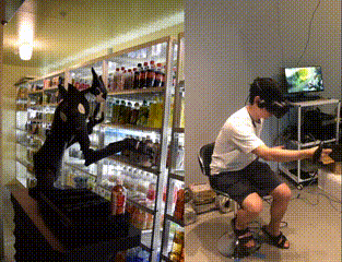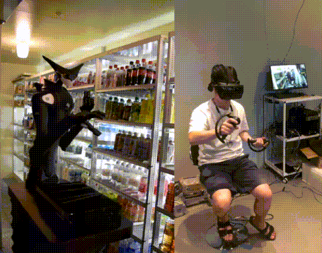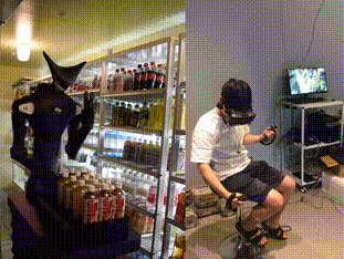 图中,技术人员利用VR装置坐在Telexistence公司的工作台中,而Model-T则位于几公里外的全家商店中。Model-T跟随技术人员做相同的动作和抓取动作,没一会儿,就将一箱饮品全部放置在商品架上