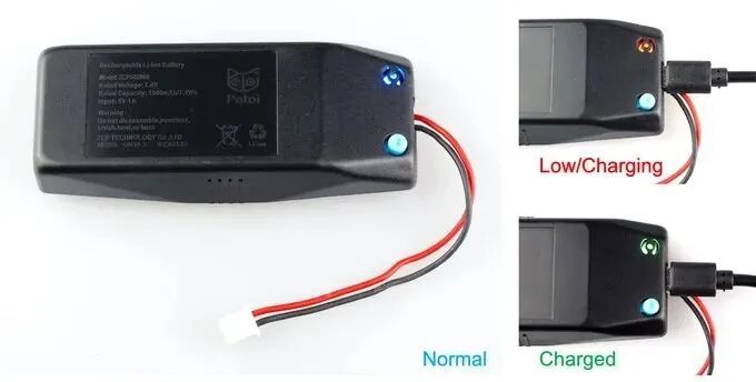 电池是带有内置充电和保护电路的锂离子电池组。它可以滑入Bittle下方的轨道并调整其质心。可为Bittle提供至少一小时的连续行走动力,具有RGB LED指示电池状态。