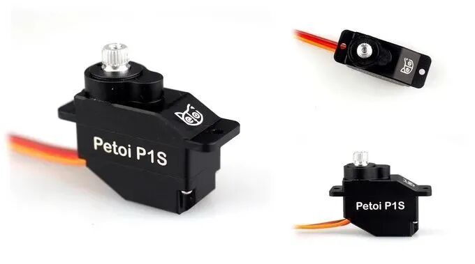 Bittle使用了9个P1S伺服器,它是一种细长的,快速的伺服系统,可控制的角度为270度。其中八个用于行走关节,一个用于头部摇动。还提供一个备用伺服器进行更换,因为有一定磨损后会消耗有刷电机。