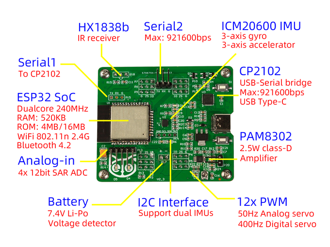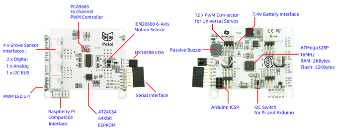 BiBoard V0具有240MHz双核CPU,内置WiFi 和蓝牙,12个PWM伺服引脚以及红外接收器。它具有多个通信端口以连接到其他设备。