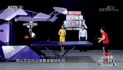 2017年,中国乒乓球学院和新松公司合作研发的、国内首台具有自主知识产权并产品化的乒乓球机器人,在第19届中国国际工业博览会上正式亮相。第二年世界人工智能大会,一个拿着乒乓球拍的机械手臂展现在大家面前,它能像人一样精准地把球给打回来,并在年底和邓亚萍一起登上央视,对邓亚萍的高速球、弧圈球都能迅速应对,赢得了声声赞叹。