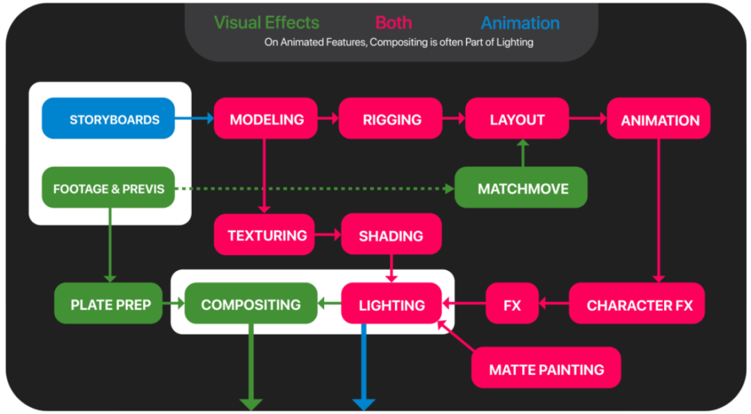 电影制作流水线概述:Storyboard /Footage/Previs(分镜脚本等)是我们获取故事资源的途径,而Compositing/Lighting(合成/照明)则是电影的最后阶段。但视觉效果电影与动画电影略有不同,因为你以分镜的形式额外添加电影镜头元素。