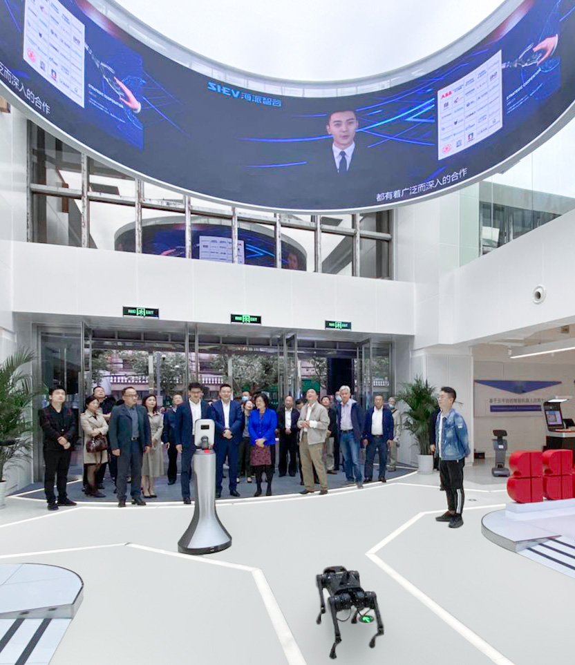 首先来到海派智谷一层人工智能体验大厅,由工博士机器人豹小秘作为主讲员,引导各领导和嘉宾参观了“海派智谷5G人工智能新世界”,观看了先进智能制造装备的代表-安川、ABB智能制造展区。了解了目前智能制造数字化、智能化和信息化的发展程度。