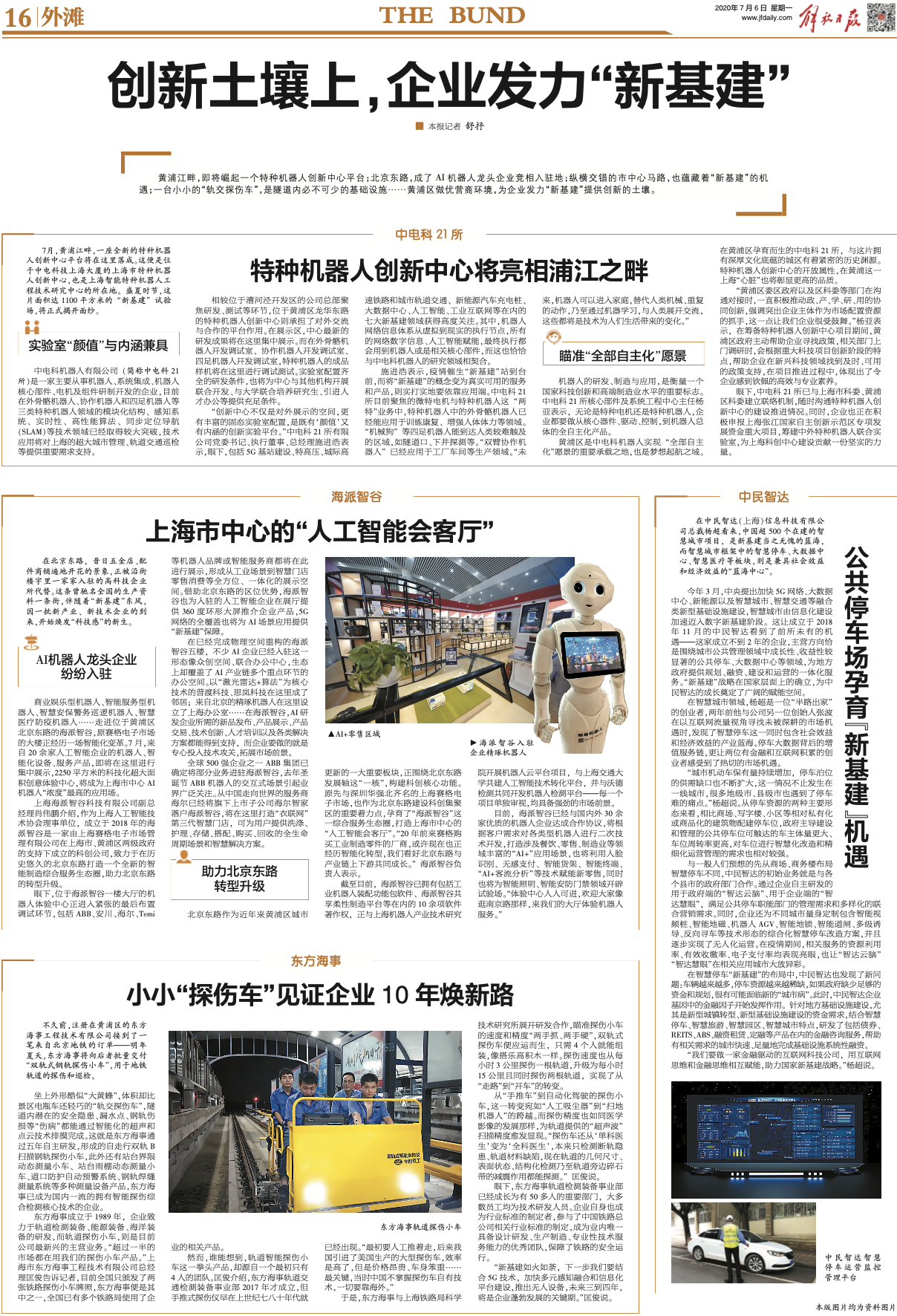 《解放日报》刊发题为《上海市中心里的“人工智能会客厅”》并进行深度报道,报道我司(上海海派智谷科技有限公司)作为首批上海人工智能服务机器人联盟成员,即将在本月(7月9日)在北京东路海派智谷一楼进行展示中心进行超大面积的智能机器人创意体验活动。并对海派智谷助力北京东路转型升级做了详细介绍。